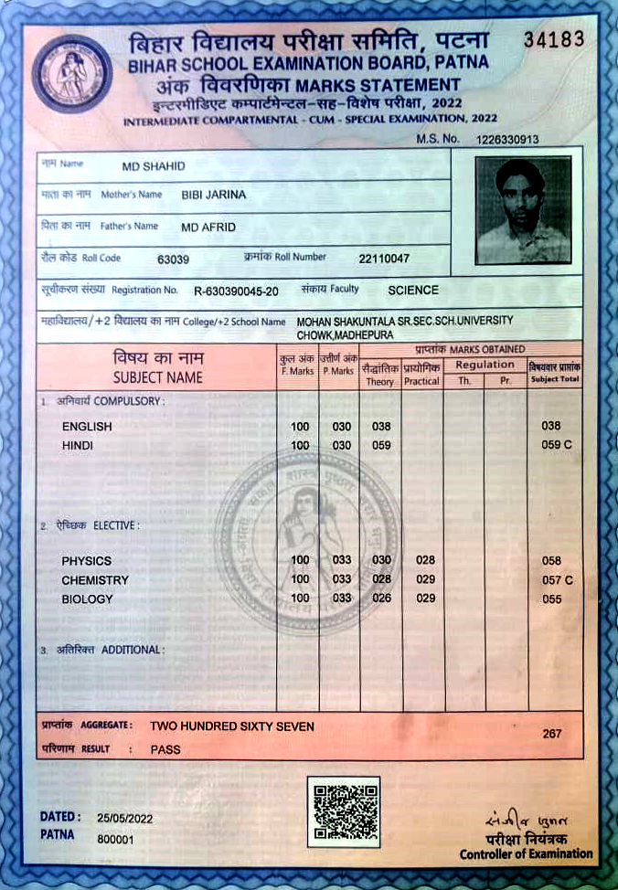 | Exam | Full Marks | Pass Marks | Marks Obtained |