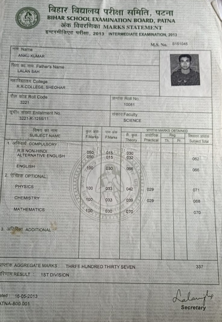 | Exam | Full Marks | Pass Marks | Marks Obtained |