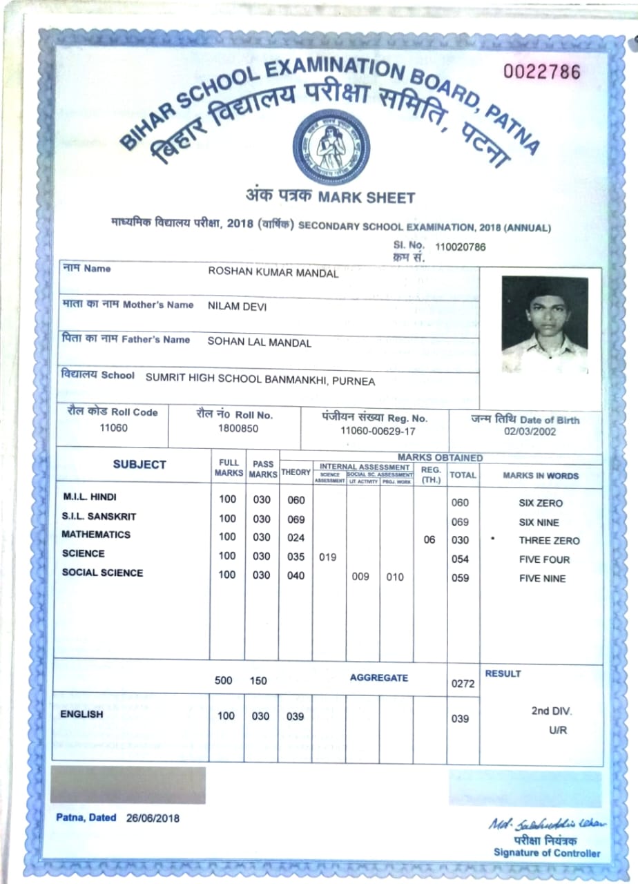 | Exam | Full Marks | Pass Marks | Marks Obtained |