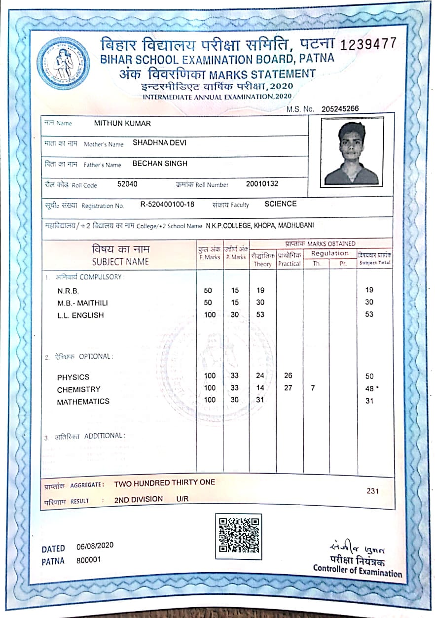 | Exam | Full Marks | Pass Marks | Marks Obtained |