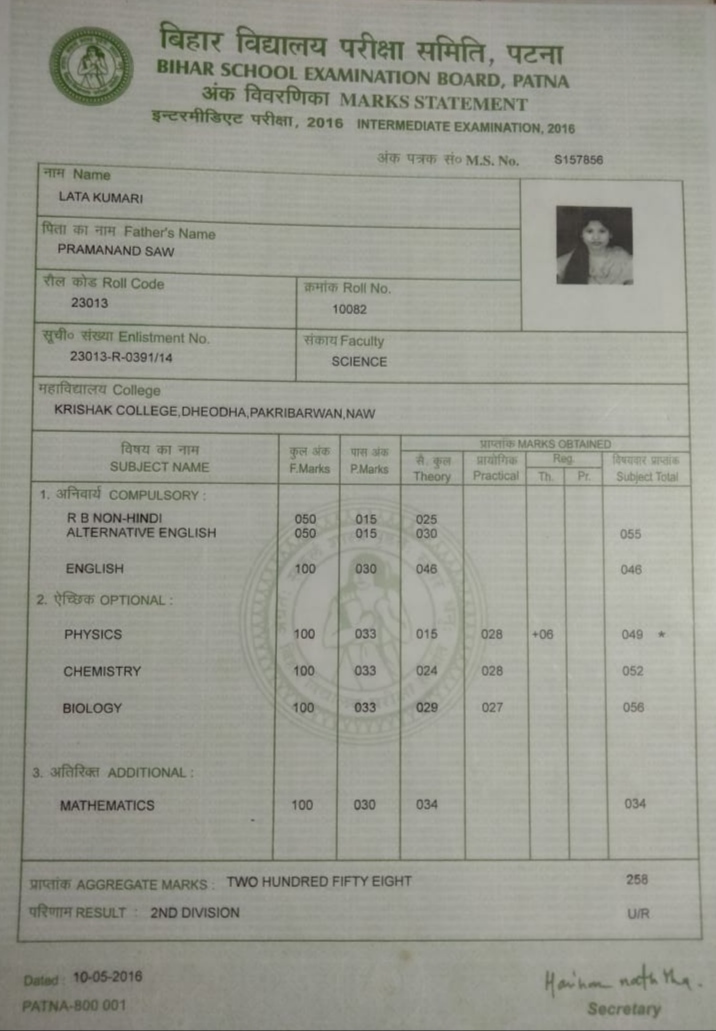 | Exam | Full Marks | Pass Marks | Marks Obtained |