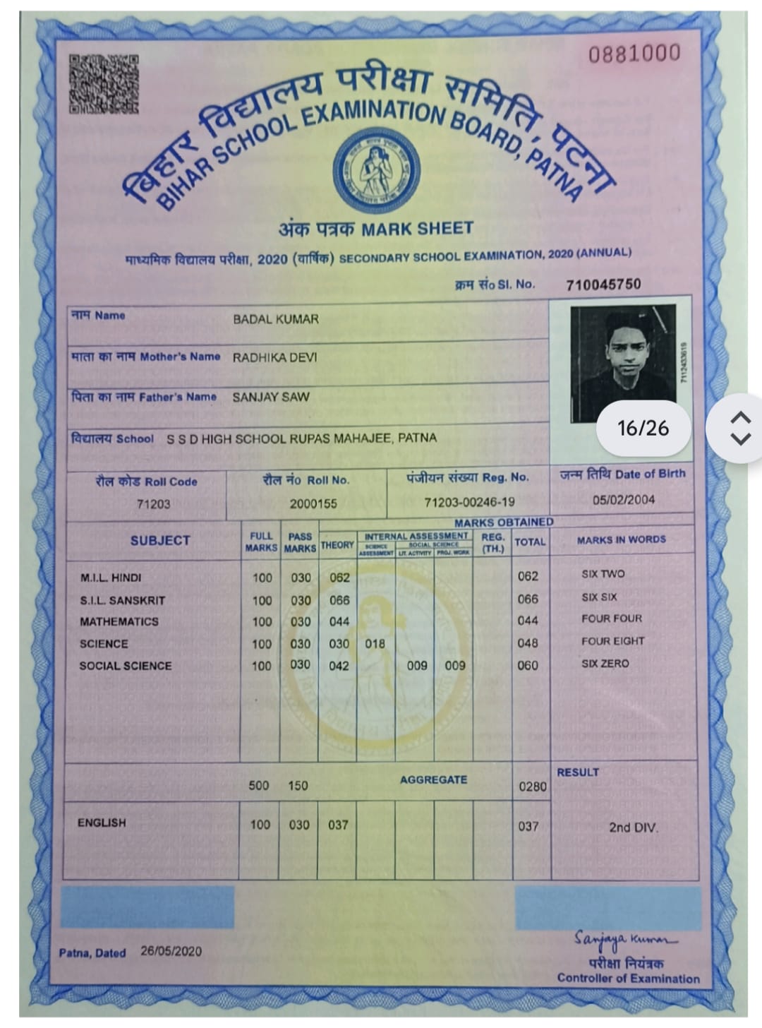 | Exam | Full Marks | Pass Marks | Marks Obtained |