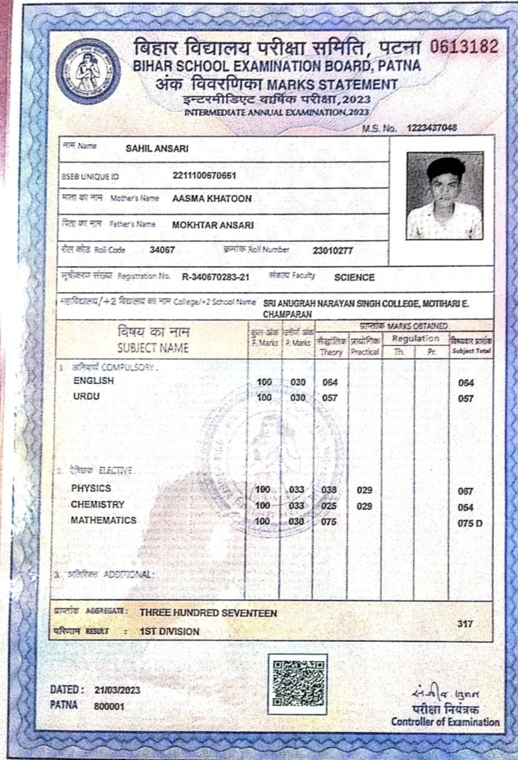 | Exam | Full Marks | Pass Marks | Marks Obtained |