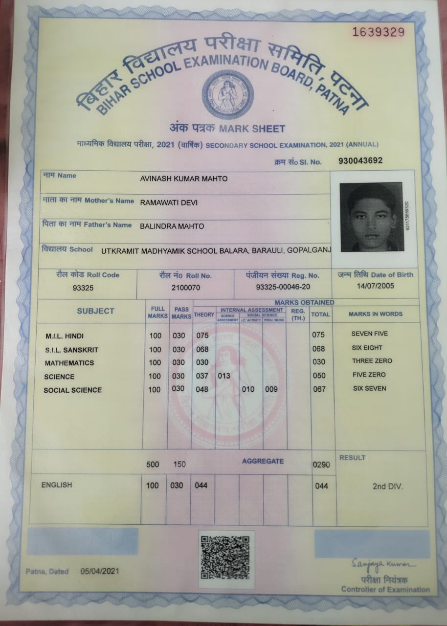 | Exam | Full Marks | Pass Marks | Marks Obtained |