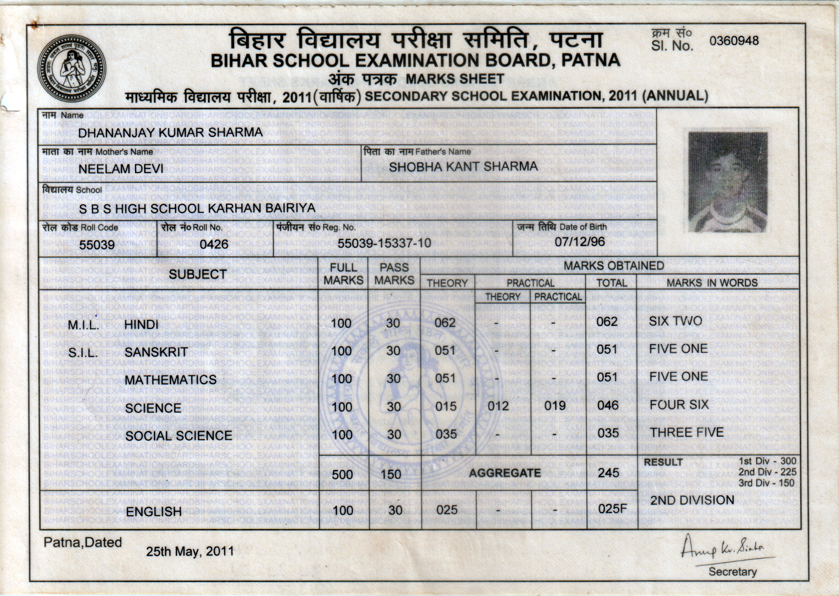 | Exam | Full Marks | Pass Marks | Marks Obtained |