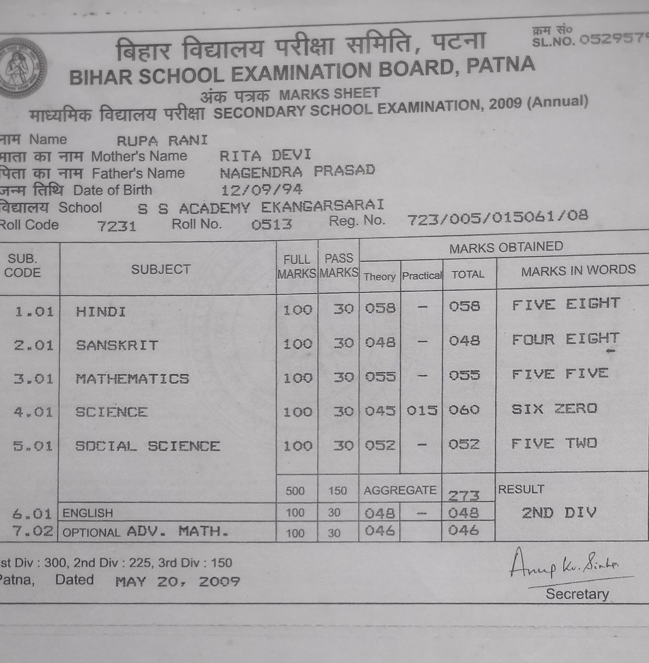 | Exam | Full Marks | Pass Marks | Marks Obtained |
