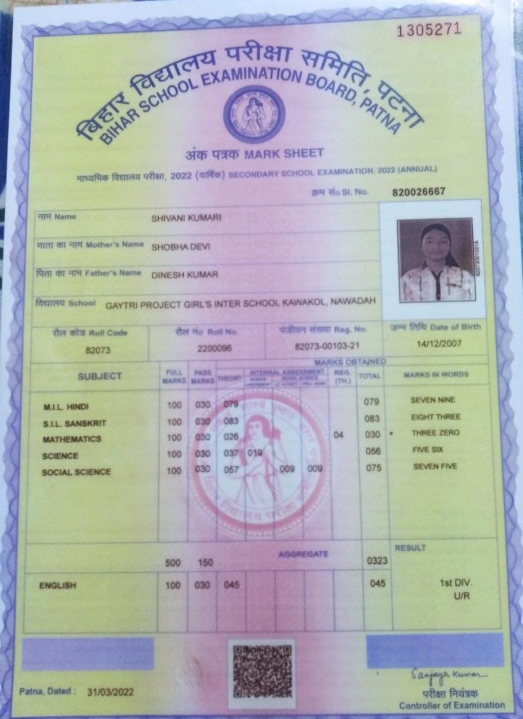 | Exam | Full Marks | Pass Marks | Marks Obtained |