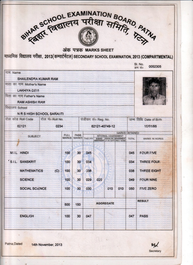 | Exam | Full Marks | Pass Marks | Marks Obtained |