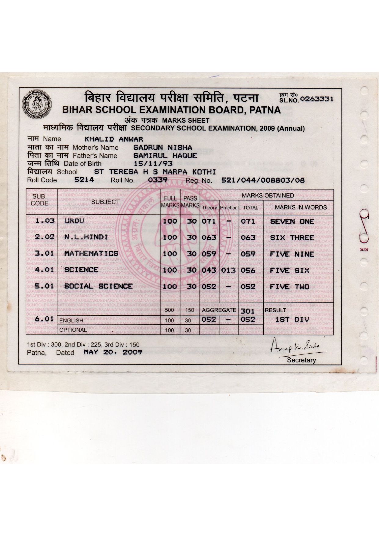 | Exam | Full Marks | Pass Marks | Marks Obtained |