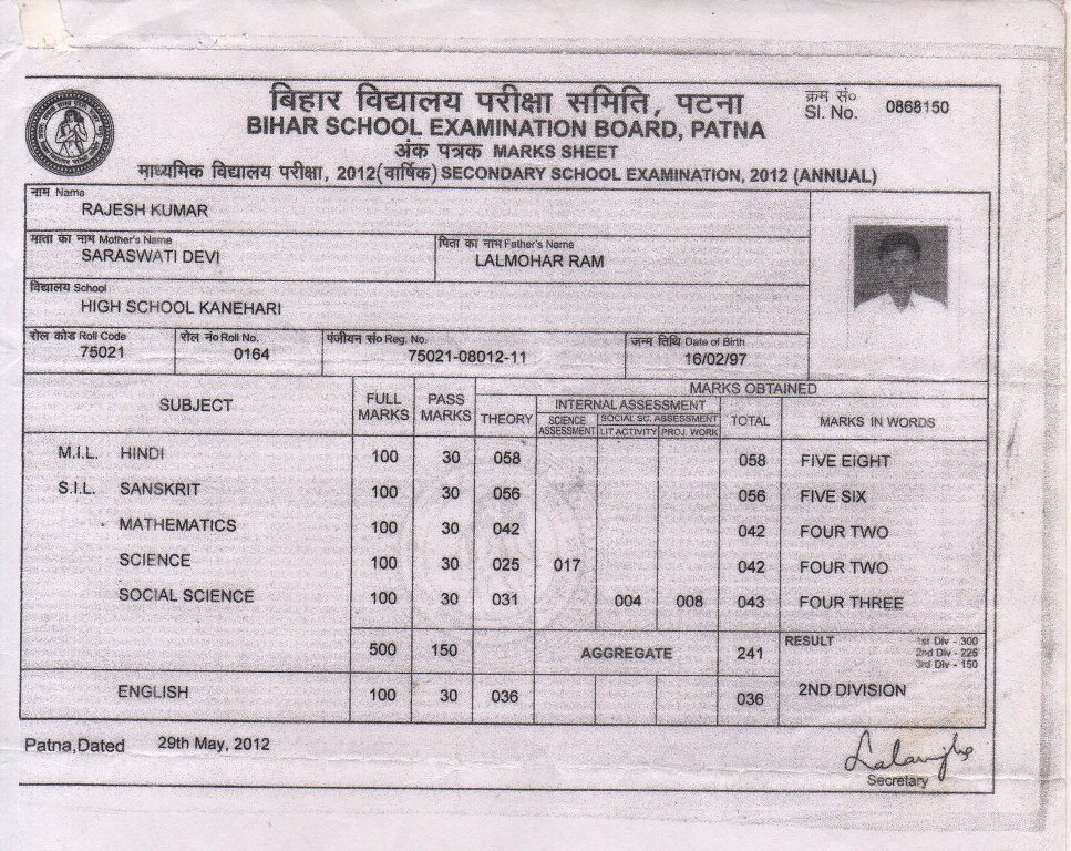 | Exam | Full Marks | Pass Marks | Marks Obtained |