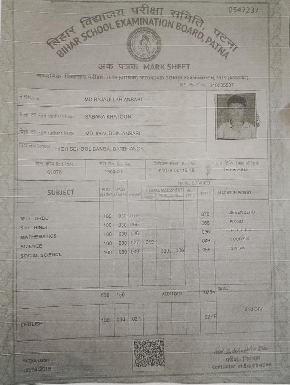 | Exam | Full Marks | Pass Marks | Marks Obtained |