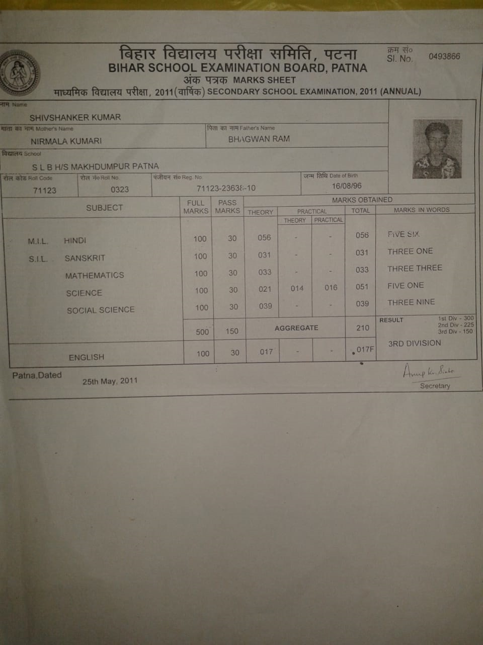 | Exam | Full Marks | Pass Marks | Marks Obtained |