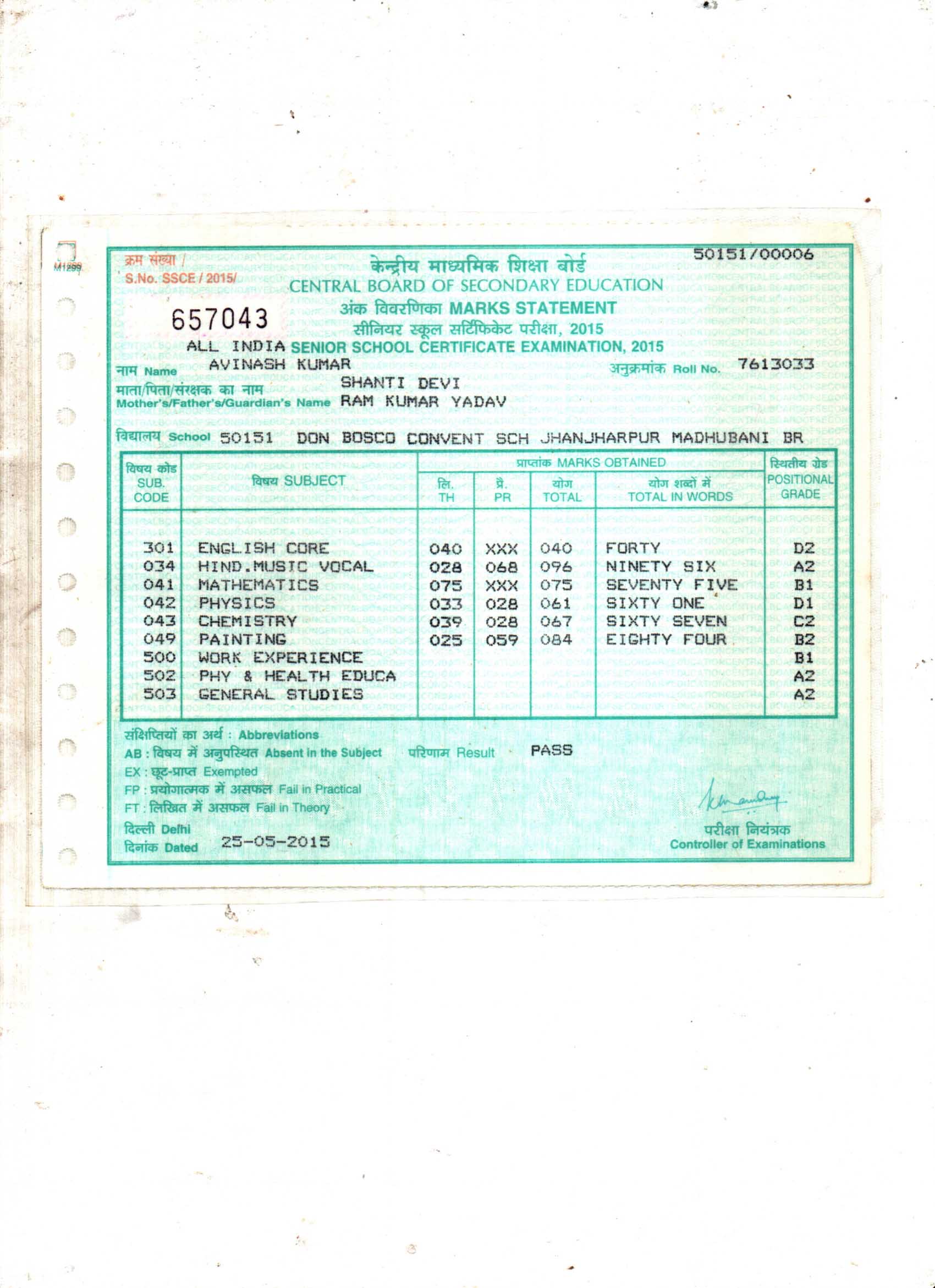 | Exam | Full Marks | Pass Marks | Marks Obtained |