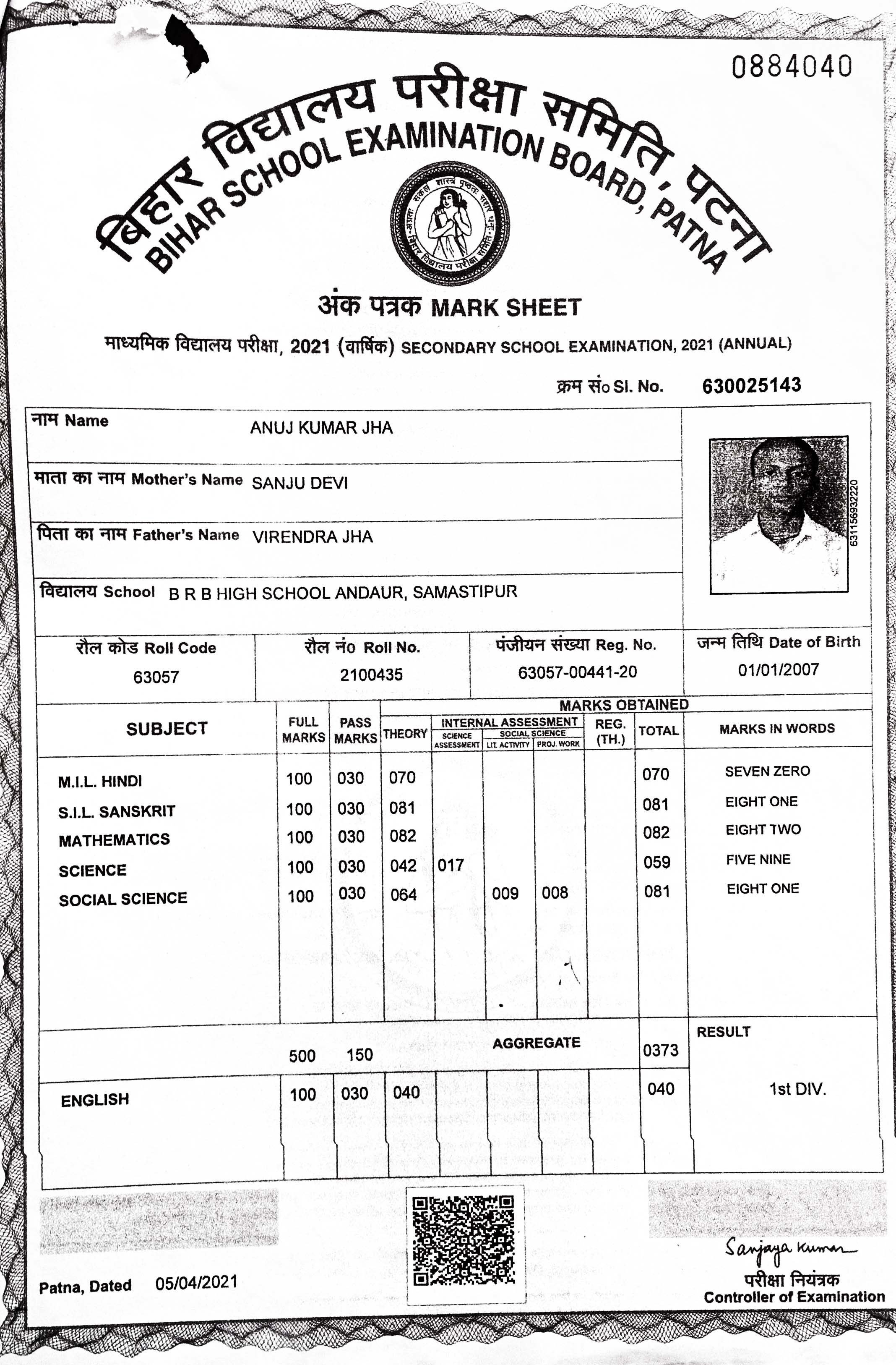 | Exam | Full Marks | Pass Marks | Marks Obtained |