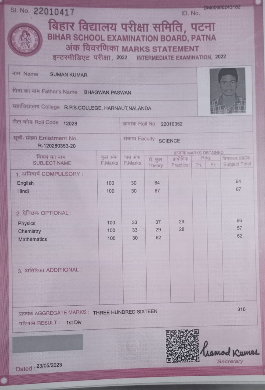 | Exam | Full Marks | Pass Marks | Marks Obtained |
