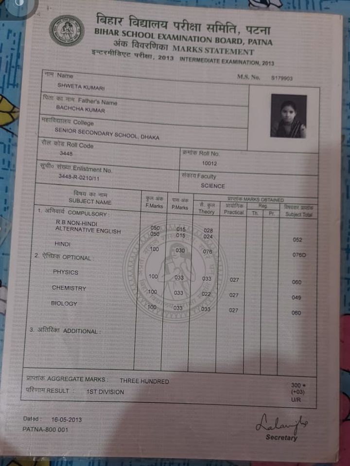 | Exam | Full Marks | Pass Marks | Marks Obtained |