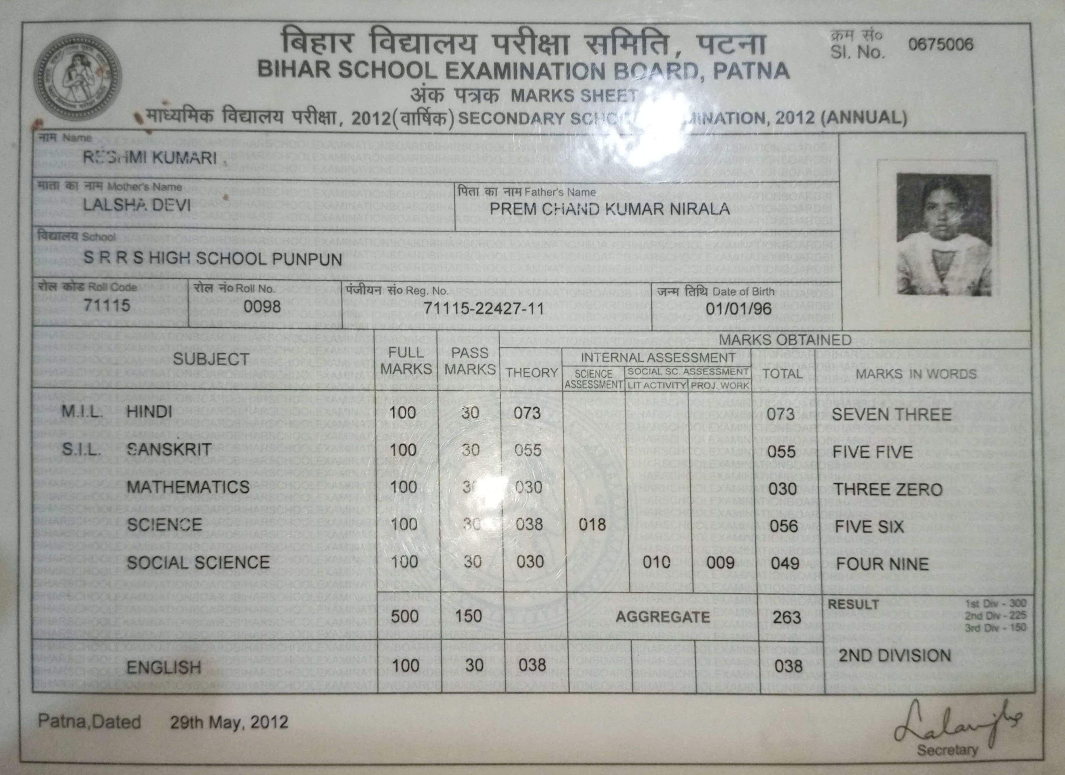 | Exam | Full Marks | Pass Marks | Marks Obtained |