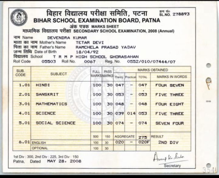 | Exam | Full Marks | Pass Marks | Marks Obtained |