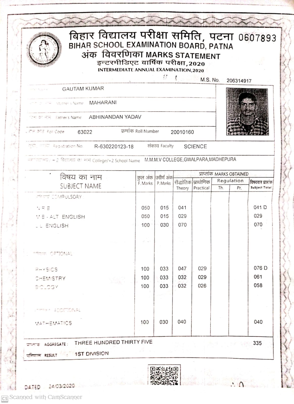 | Exam | Full Marks | Pass Marks | Marks Obtained |