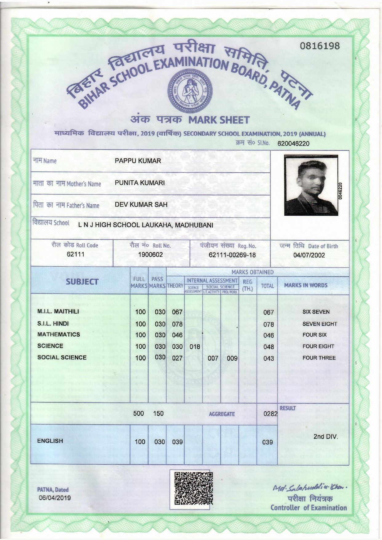 | Exam | Full Marks | Pass Marks | Marks Obtained |