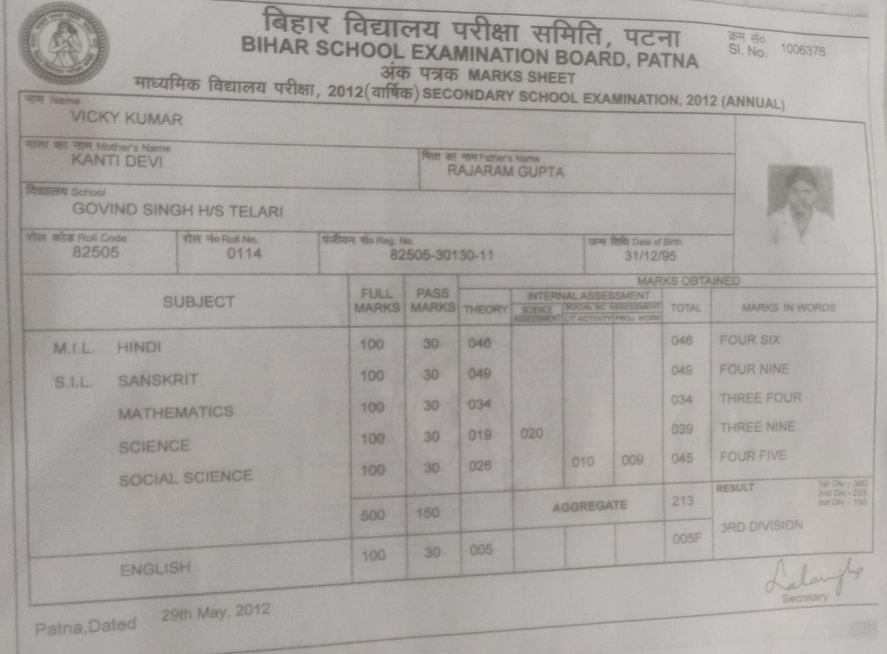 | Exam | Full Marks | Pass Marks | Marks Obtained |