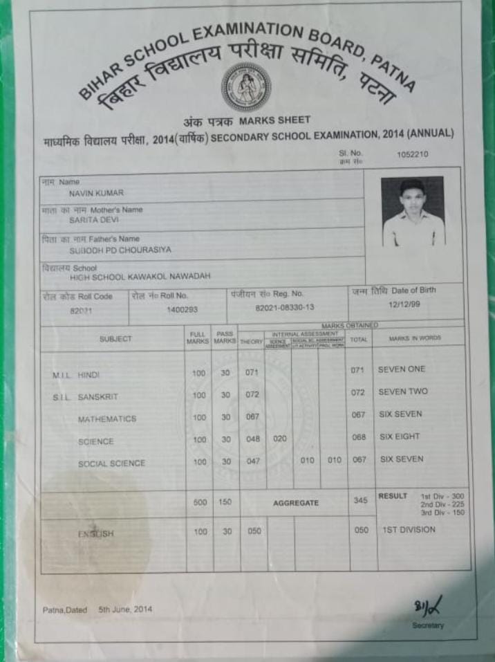 | Exam | Full Marks | Pass Marks | Marks Obtained |
