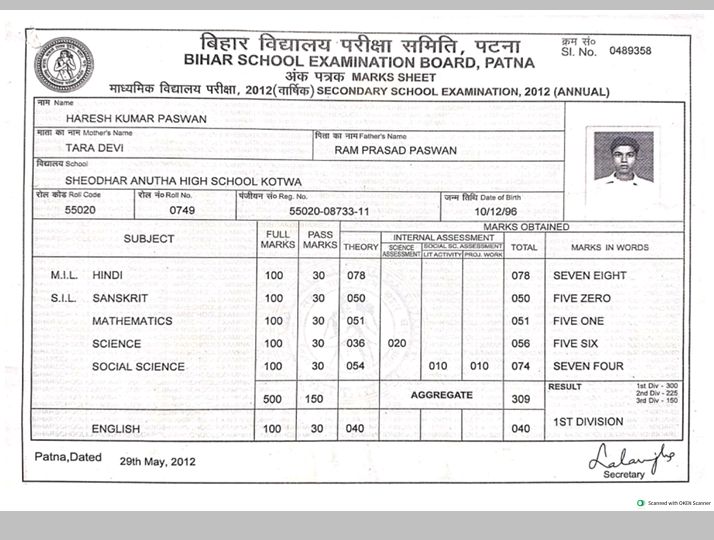 | Exam | Full Marks | Pass Marks | Marks Obtained |