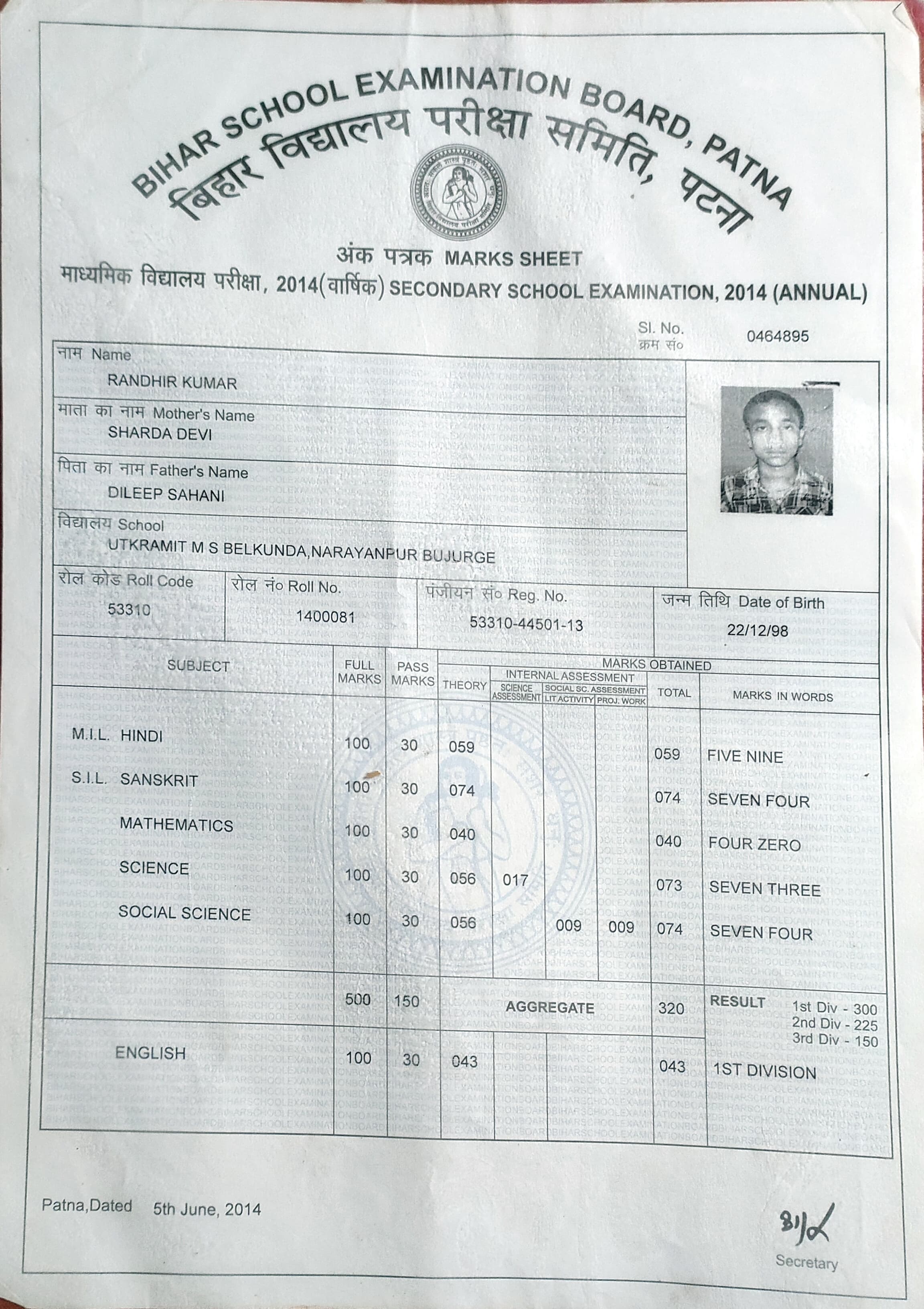 | Exam | Full Marks | Pass Marks | Marks Obtained |
