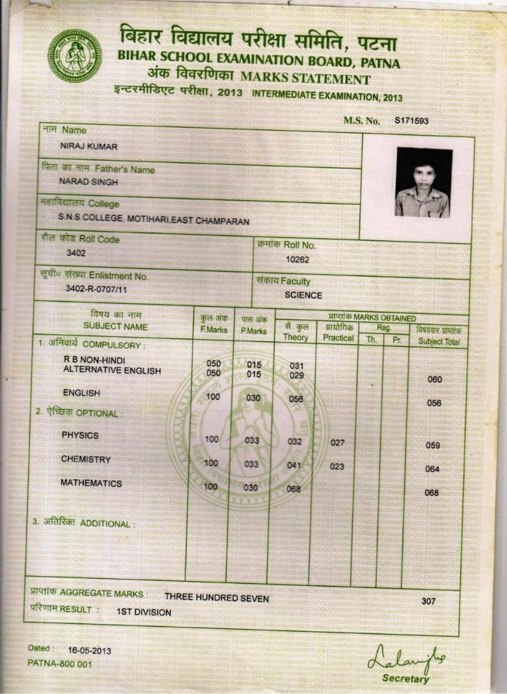 | Exam | Full Marks | Pass Marks | Marks Obtained |