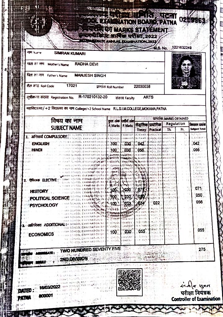 | Exam | Full Marks | Pass Marks | Marks Obtained |