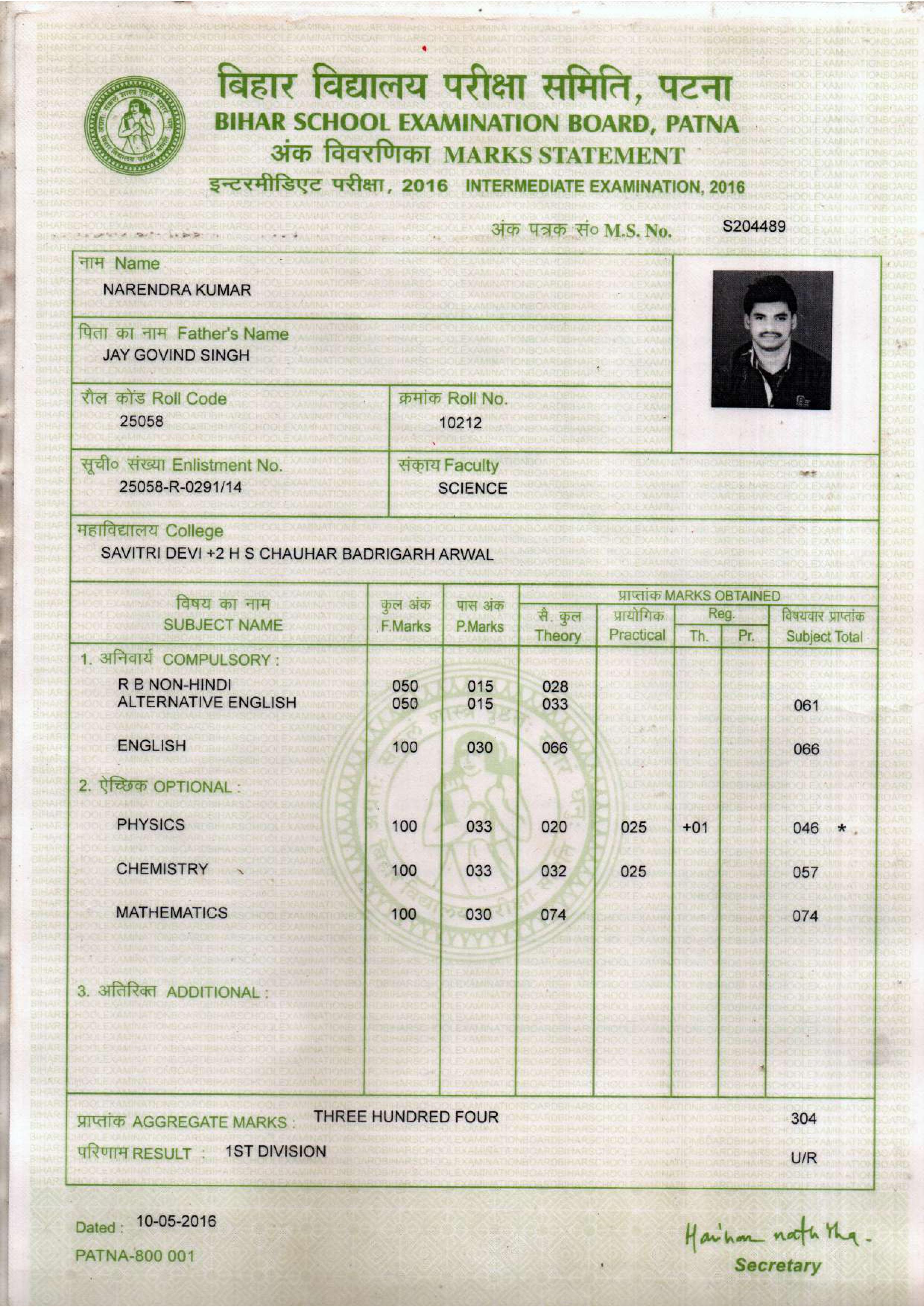 | Exam | Full Marks | Pass Marks | Marks Obtained |