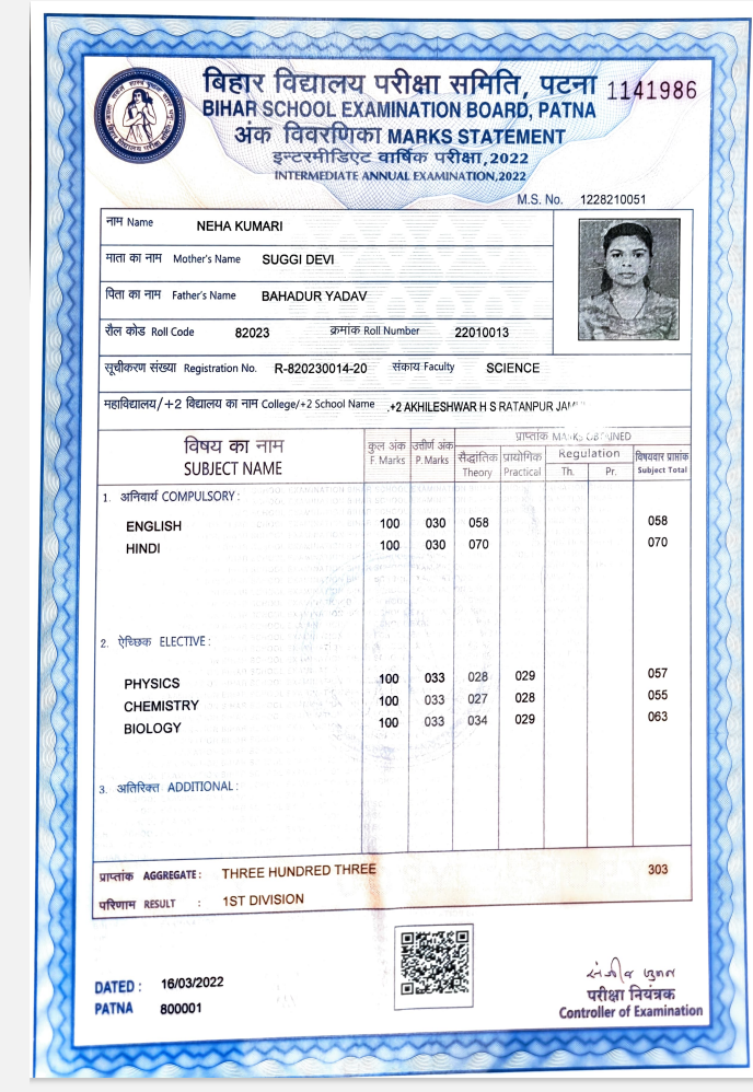 | Exam | Full Marks | Pass Marks | Marks Obtained |
