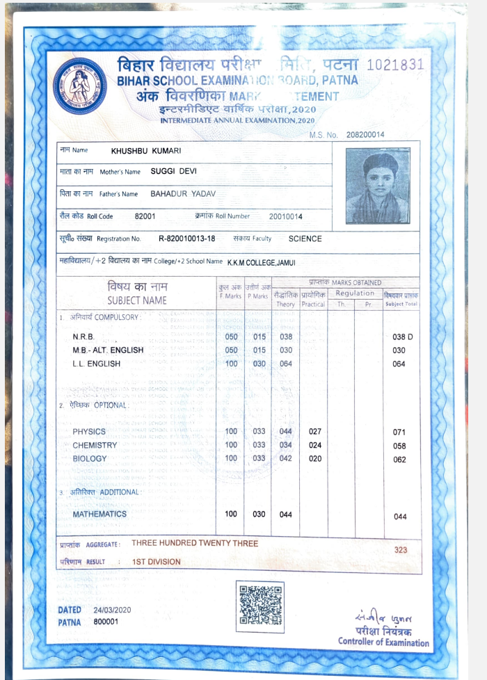 | Exam | Full Marks | Pass Marks | Marks Obtained |