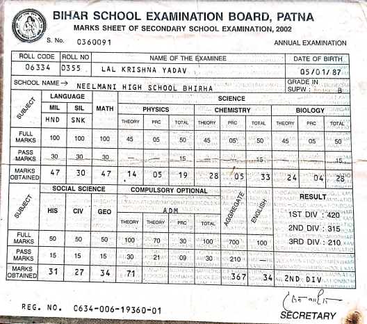 | Exam | Full Marks | Pass Marks | Marks Obtained |