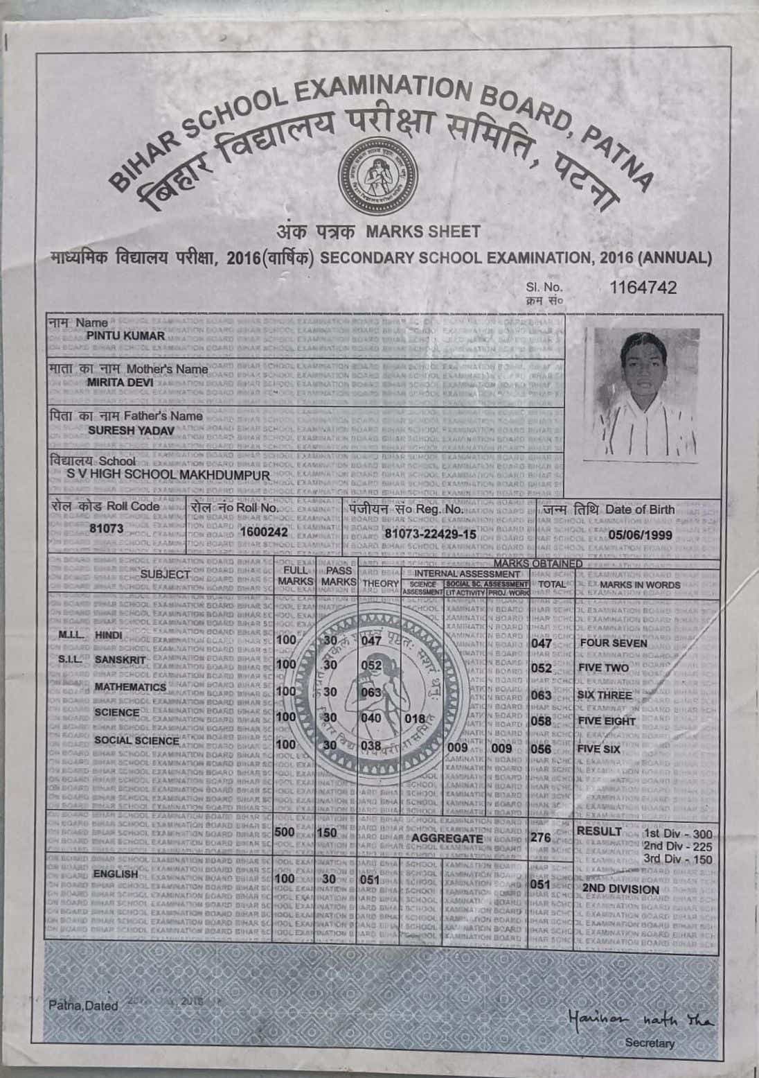 | Exam | Full Marks | Pass Marks | Marks Obtained |