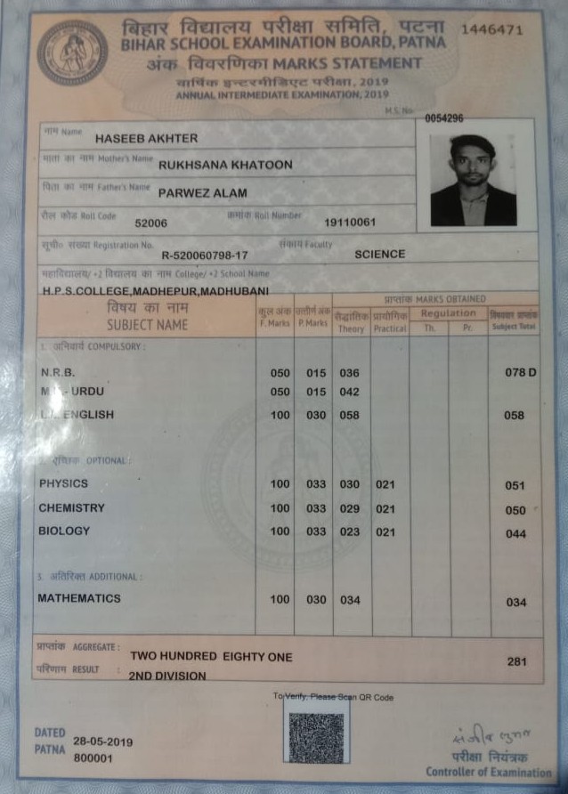 | Exam | Full Marks | Pass Marks | Marks Obtained |