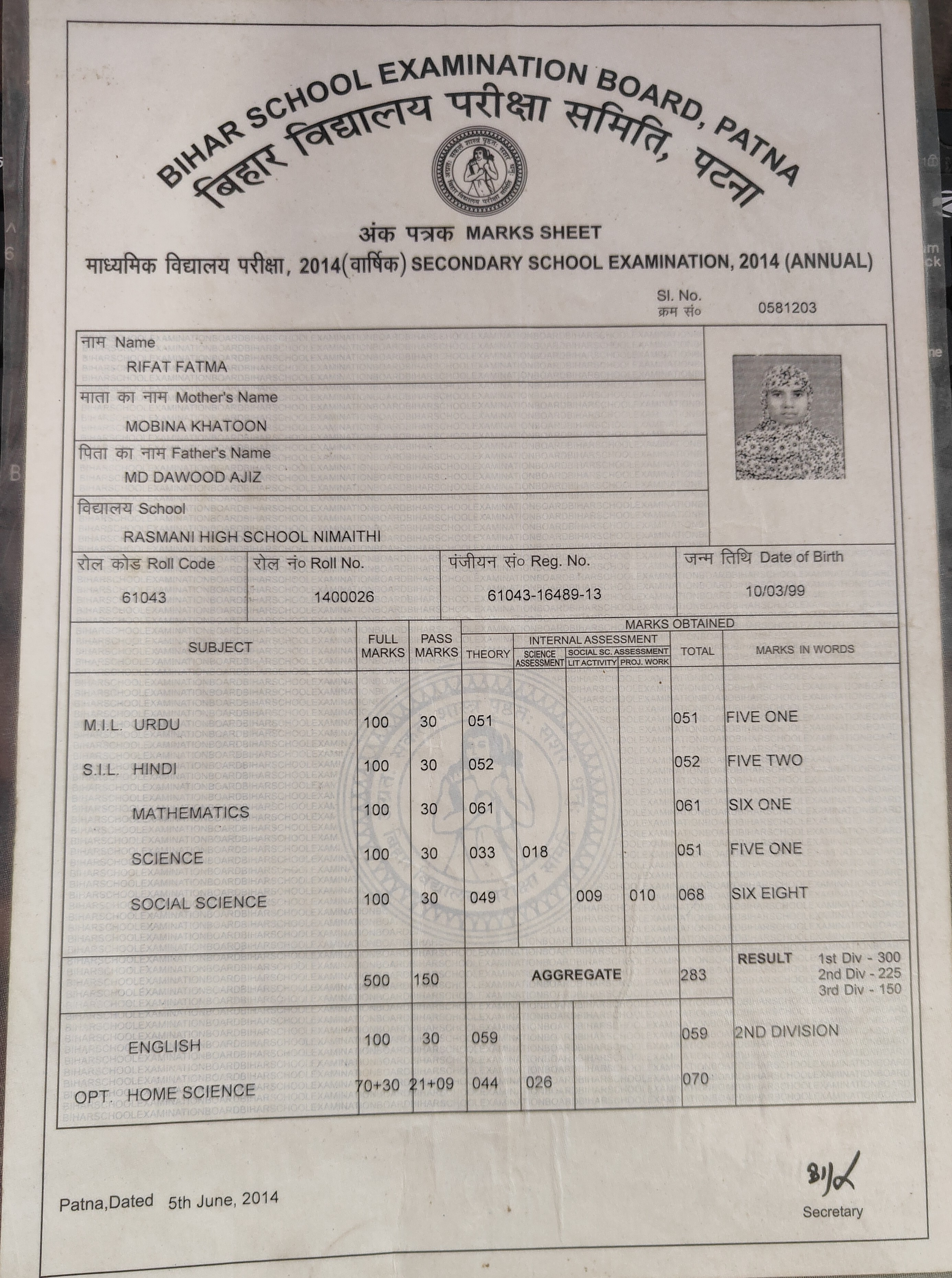 | Exam | Full Marks | Pass Marks | Marks Obtained |