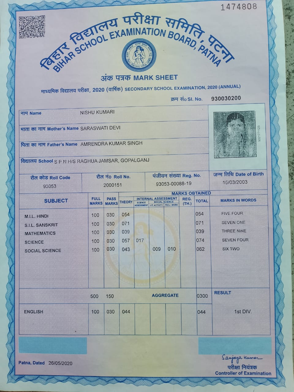 | Exam | Full Marks | Pass Marks | Marks Obtained |