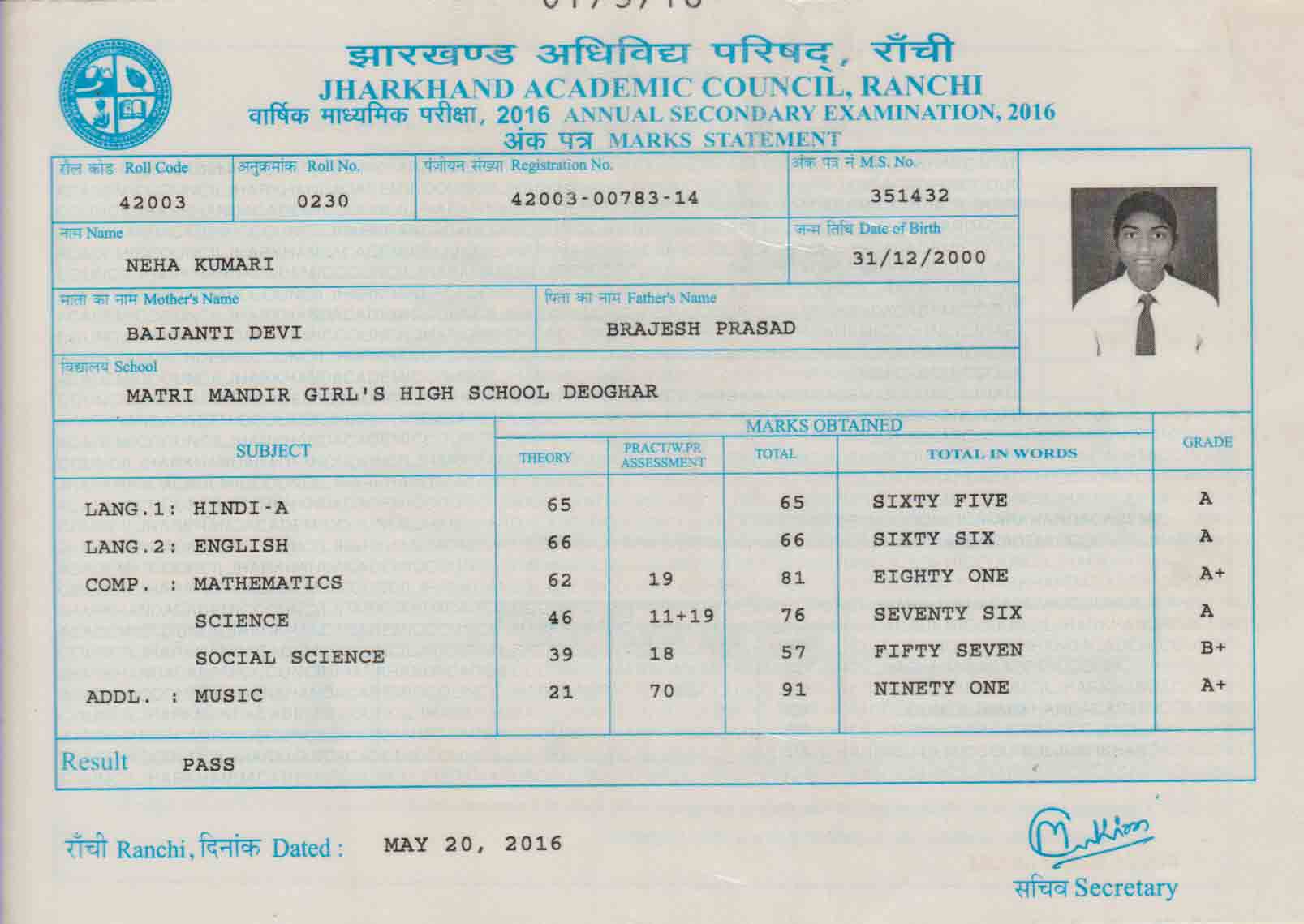 | Exam | Full Marks | Pass Marks | Marks Obtained |