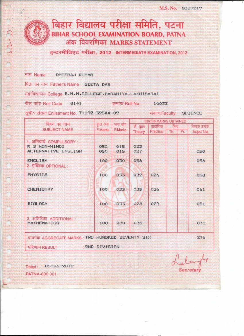 | Exam | Full Marks | Pass Marks | Marks Obtained |