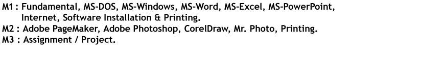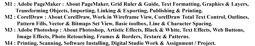 Computer CoursesDCAPDiploma In Computer Application & Publication9 MonthsMatric200.00ACTIVE ADOBE PAGEMAKER,ADOBE PHOTOSHOP,FUNDAMENTAL,HTML,INTERNET,MS ACCESS,MS DOS,MS EXCEL,MS POWERPOINT,MS WINDOWS,MS WORD,MULTIMEDIA,