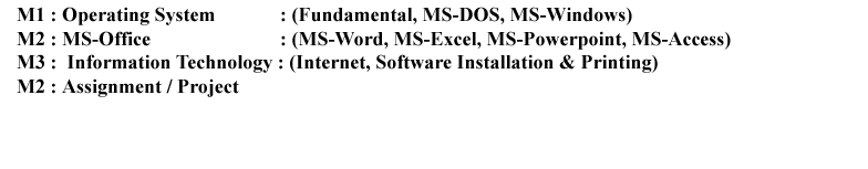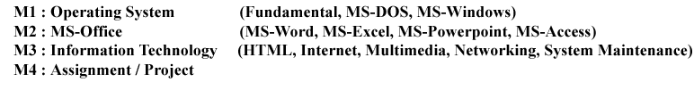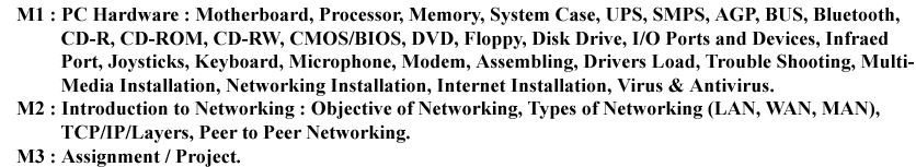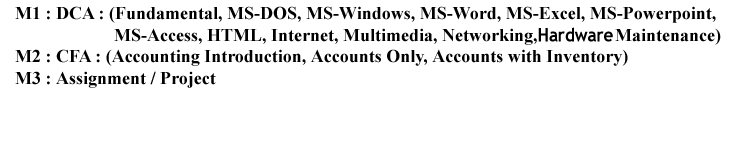 Computer CoursesCCACertificate in Computer Application3 MonthsMatric200.00ACTIVE FUNDAMENTAL,MS ACCESS,MS DOS,MS EXCEL,MS POWERPOINT,MS WINDOWS,MS WORD,